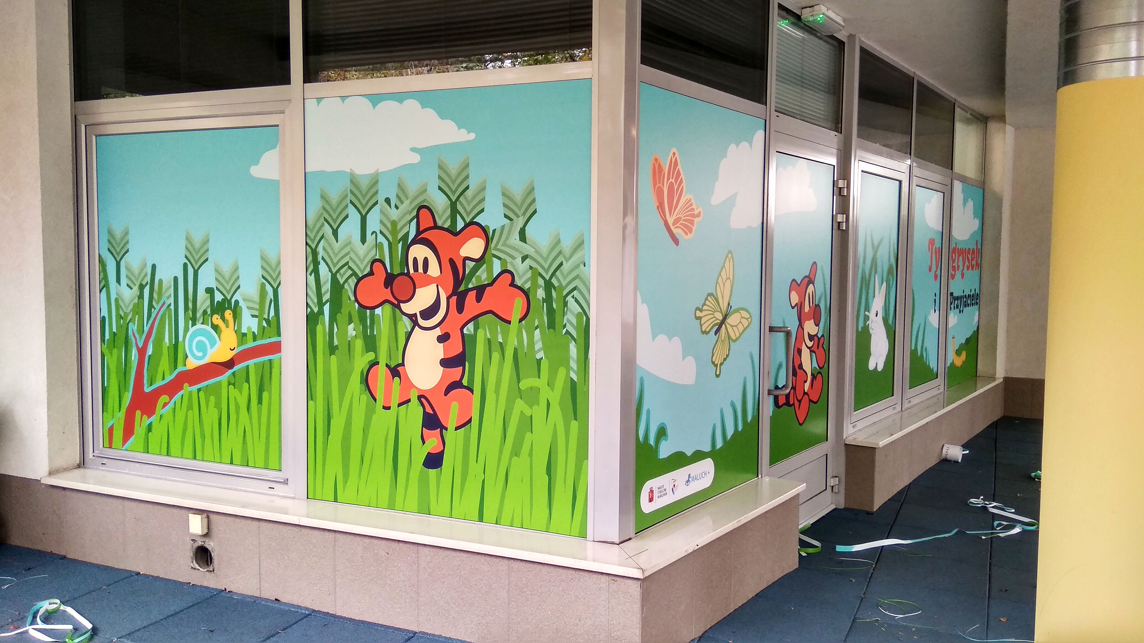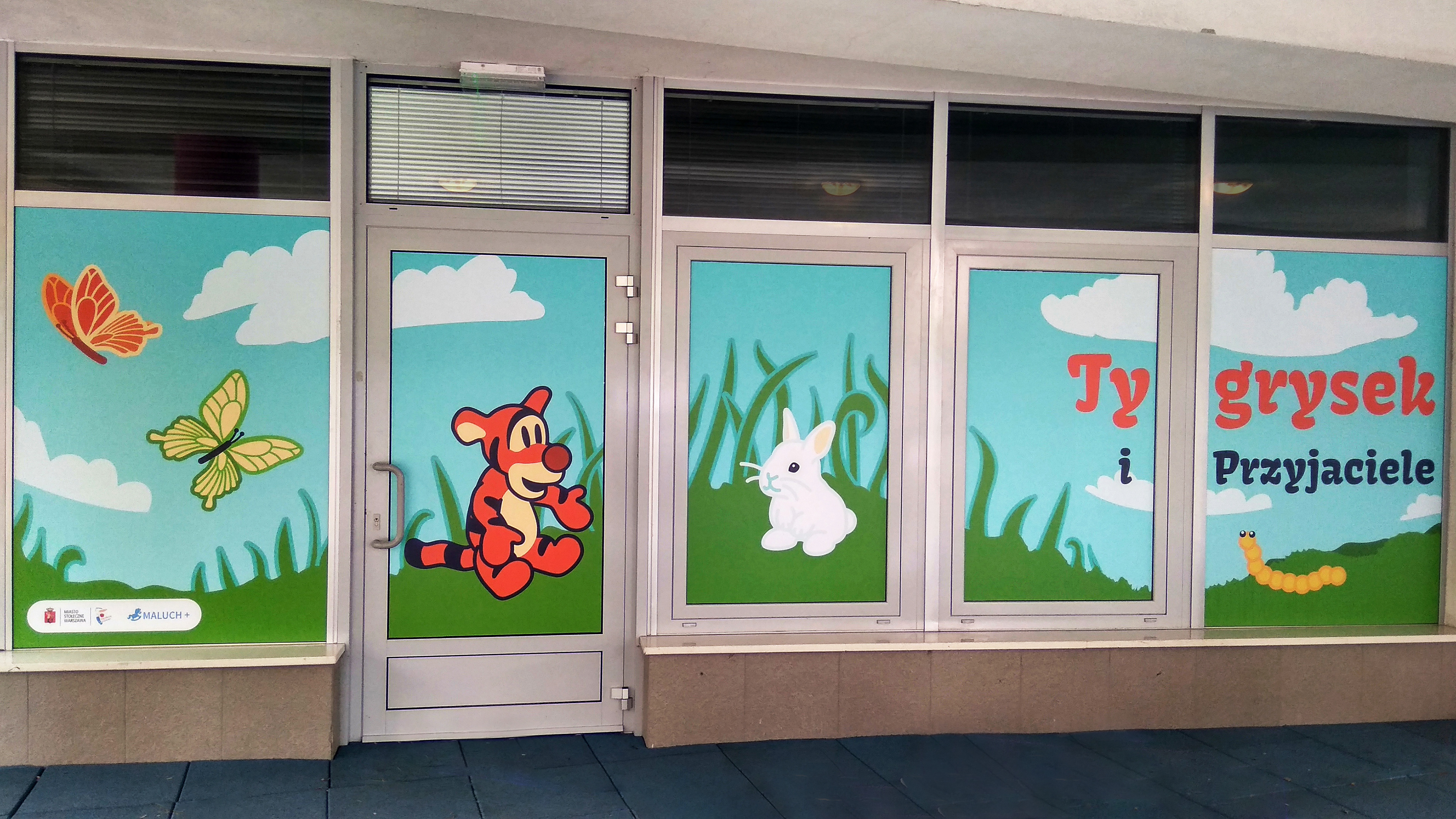 Zestaw naklejek na okna żłobka „Tygrysek i Przyjaciele”.